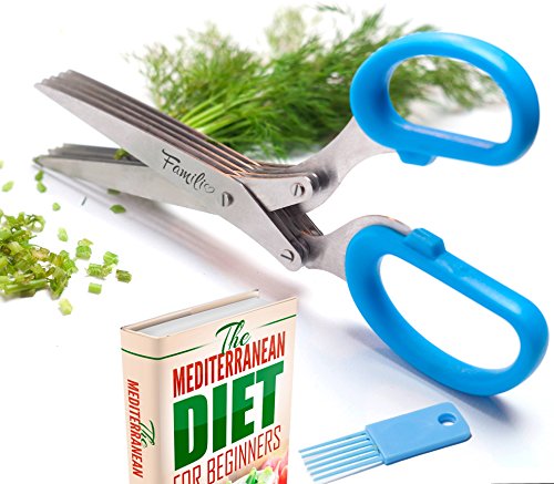 Familio - Herb Scissors - Kitchen Shear - E-BOOK bonus - Multipurpose gadgets with 5 Multi Blades and Cleaning Comb - Heavy Duty Stainless Steel - Chopper Cutter Fresh and Dry Herbs - Color Blue