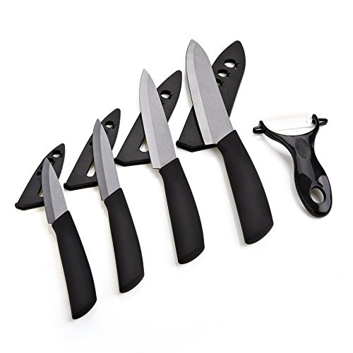 Ceramic Knife, KOOPOO Knife Set With Sheath - 6" Chef Knife, 5" Utility Knife, 4" Fruit Knife, 3" Paring Knife, One Peeler - Black Handle and Black Blade