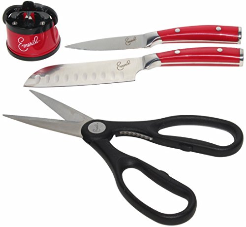 Emeril 2 Piece Forged Cutlery Chef Set with Sharpener 3.5 Paring Knife 5 Santoku Knife:Red + Black Shears