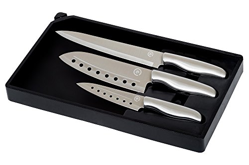 All images of Kitchen Knife Set of 3 by QHP Includes 8 Inch Carving Knife 7 Inch Santoku Knife and 5 Inch Utility Knife Stainless Steel Blade Sharp Edge Smooth Silver Handle Packed in Black Box with Sharpener