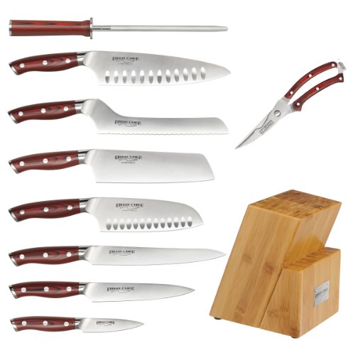 10 piece Cutlery Set with Bamboo Block knife set - CRIMSON Series by Ergo Chef